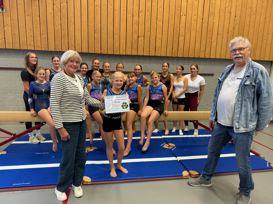 Met de fantastische cheque van maar liefst 3500 euro die werd uitgereikt door Annelies en Lex kunnen niet alleen de wedstrijdpakjes aangeschaft worden maar kan er ook weer gespaard worden voor nieuwe turntoestellen.